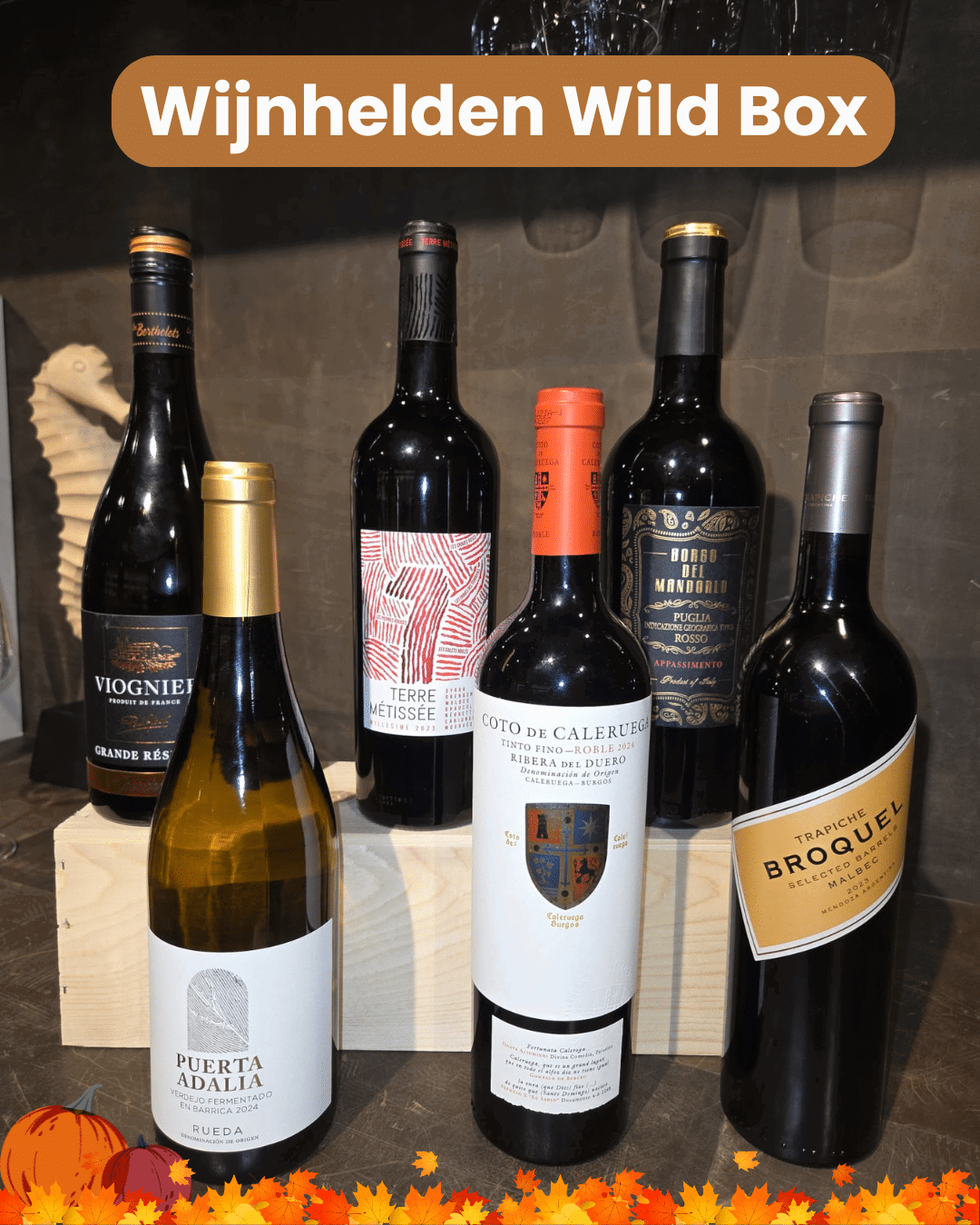 Wilde herfstsmaken vragen om wijnen die warmte, diepte en kruidigheid brengen. Denk aan een krachtige rode wijn bij hert of wildzwijn, of een elegante, houtgerijpte witte bij fazant of paddenstoelen. In onze proefbox ontdek je precies die combinaties die het seizoen op z’n best laten smaken. Laat je verleiden door zes wijnen die perfect passen bij rijke sauzen, gebraad en stoofgerechten. Proef, ontdek en geniet van het wildseizoen zoals het bedoeld is.